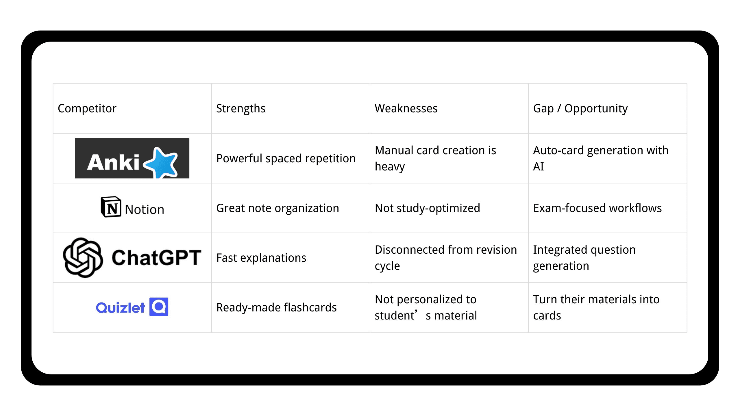 Existing tools either require too much manual effort (Anki, Notion) or provide knowledge without structure (YouTube, ChatGPT). None take over filtering, organizing, and scheduling during the critical last-minute phase.
