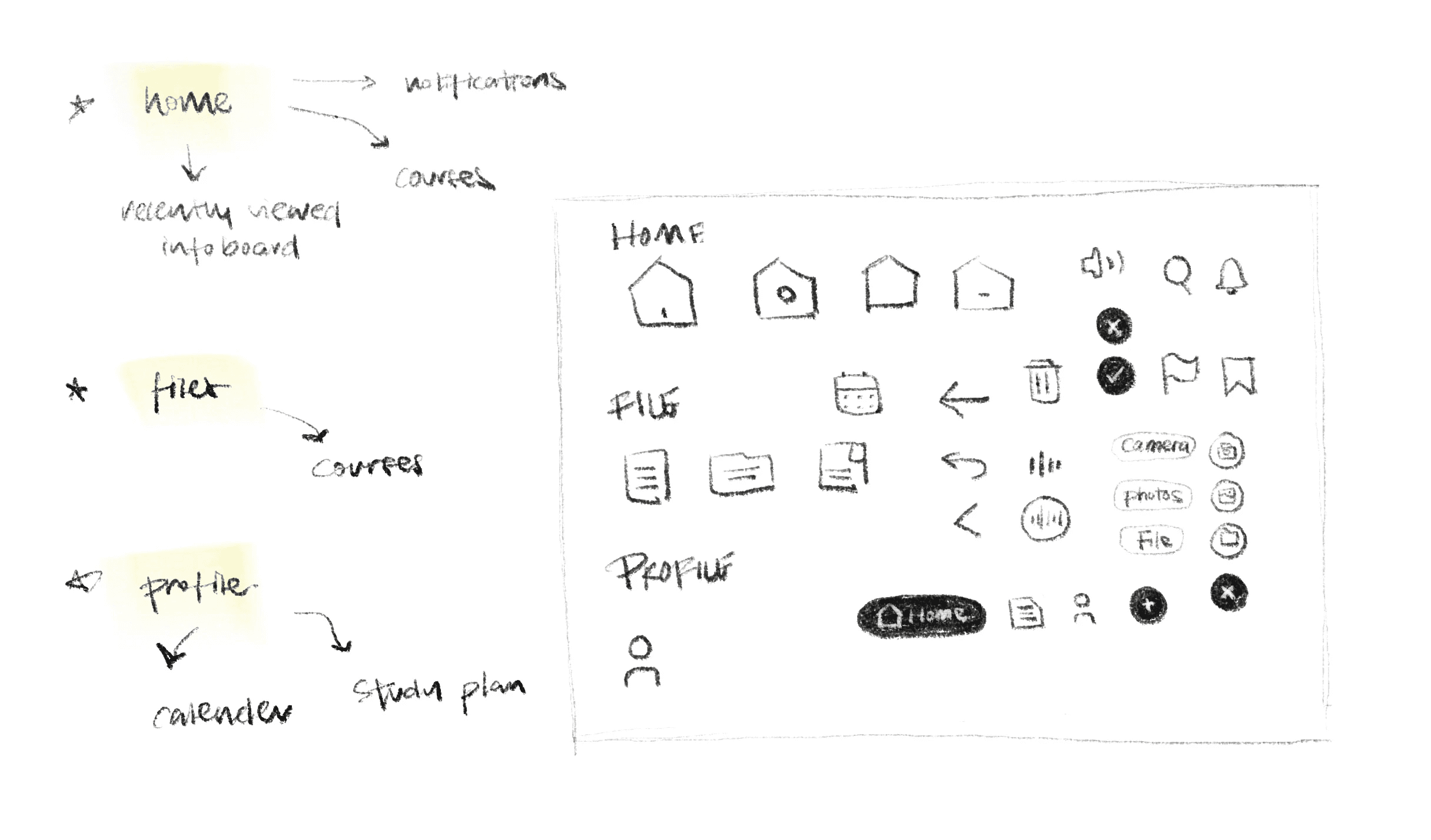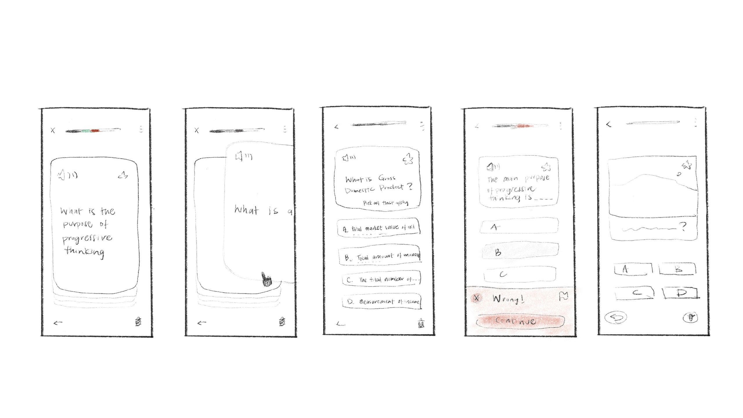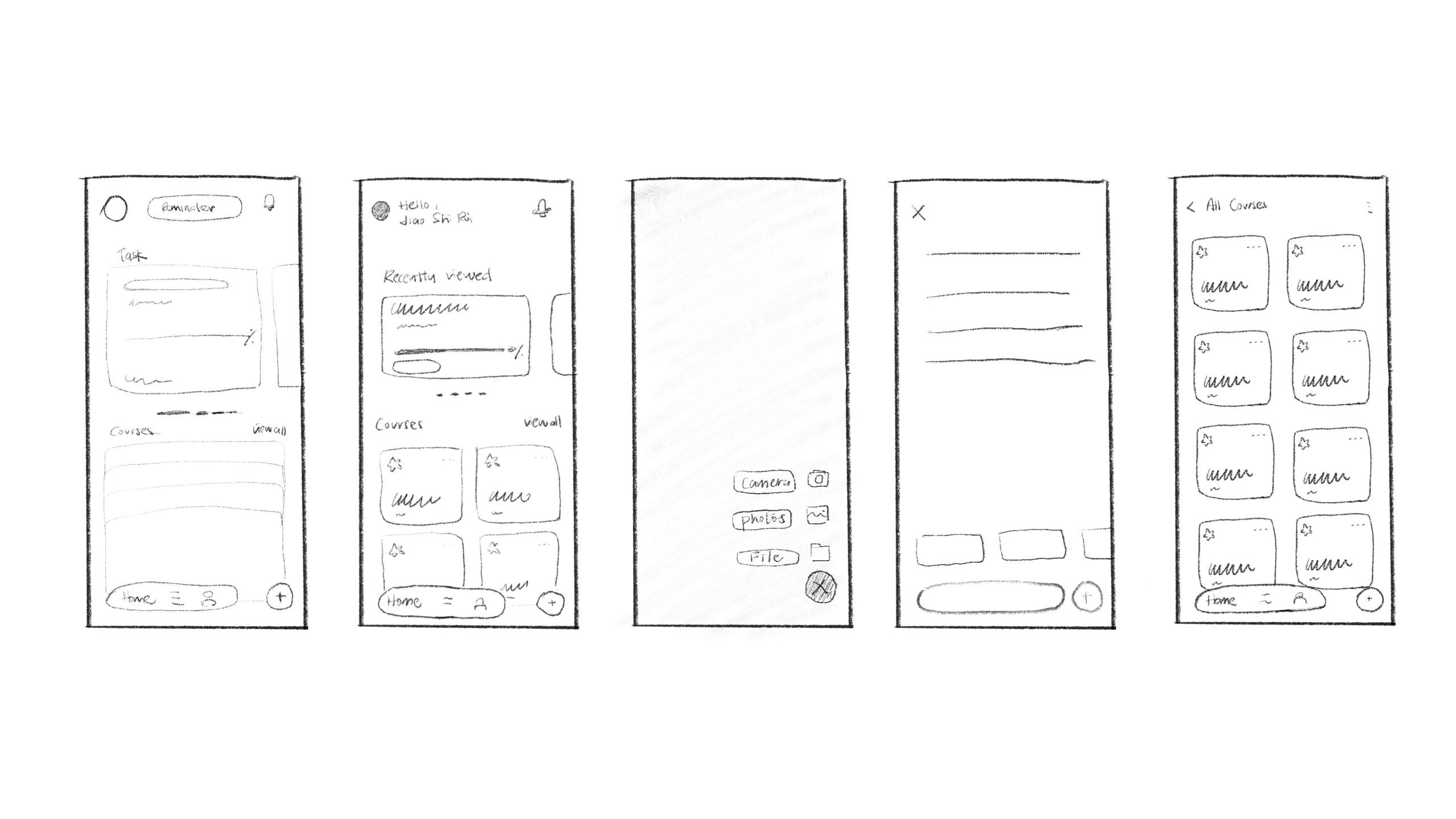 Based on the insights gathered in the research and define phases, I created low-fidelity wireframes to validate QuickCram's core user experience before moving into visual design. These sketches focus on the most critical interactions for last-minute learners: a single clear entry point, fast material upload, automatic structuring by AI, and a swipe-based micro-session flow that keeps mental effort low.