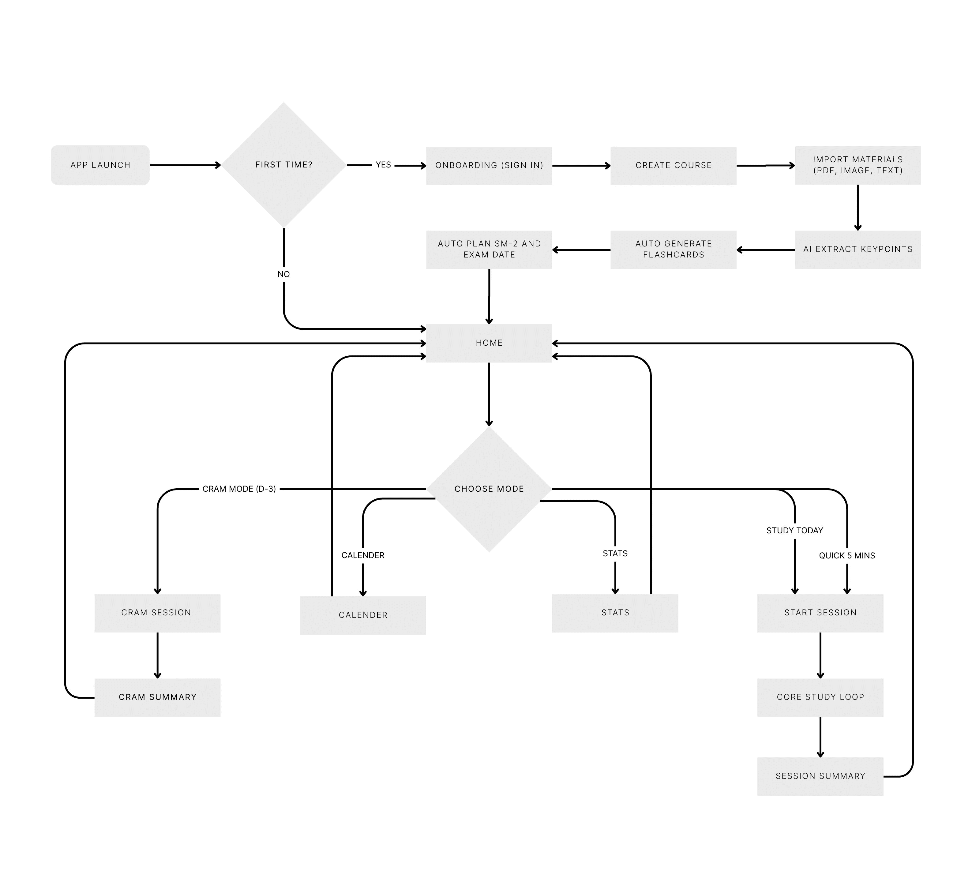 QuickCram's user flow focuses on reducing friction and accelerating the moment of first learning. Instead of forcing users to configure decks or decide what to review next, the app automates extraction, scheduling, and prioritization — so students can move from panic to progress instantly.
