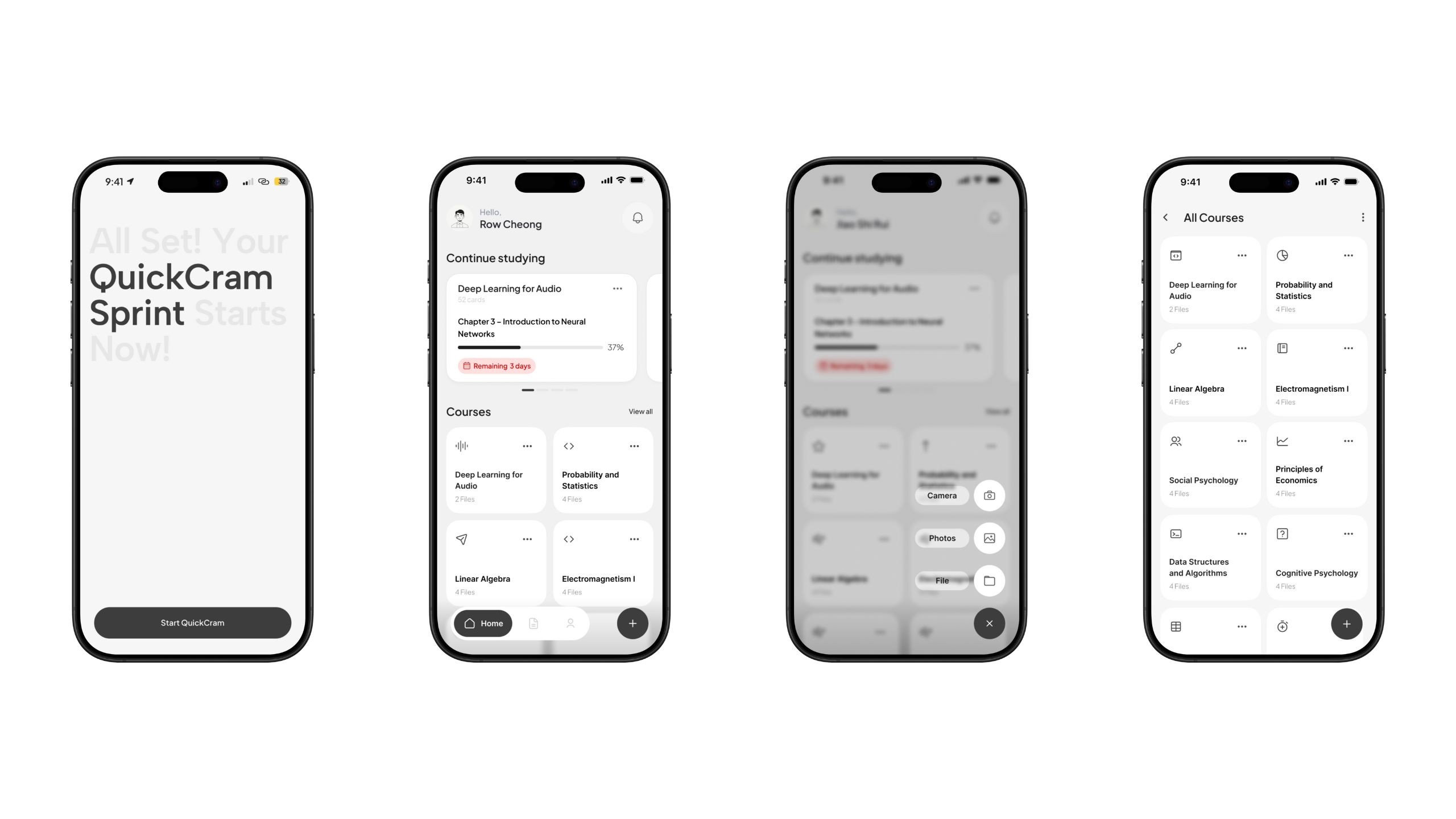 QuickCram (佛脚) is a concept mobile app for high school and university students who often start revising only a few days before exams. Instead of trying to fix procrastination, the product focuses on this specific moment: there are 3–7 days left, materials are scattered across PDFs, slides and screenshots, and the student needs a simple way to turn all of that into a clear, executable plan.